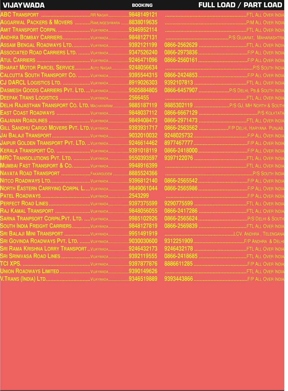 • Full Load & Part Load Vijaywada